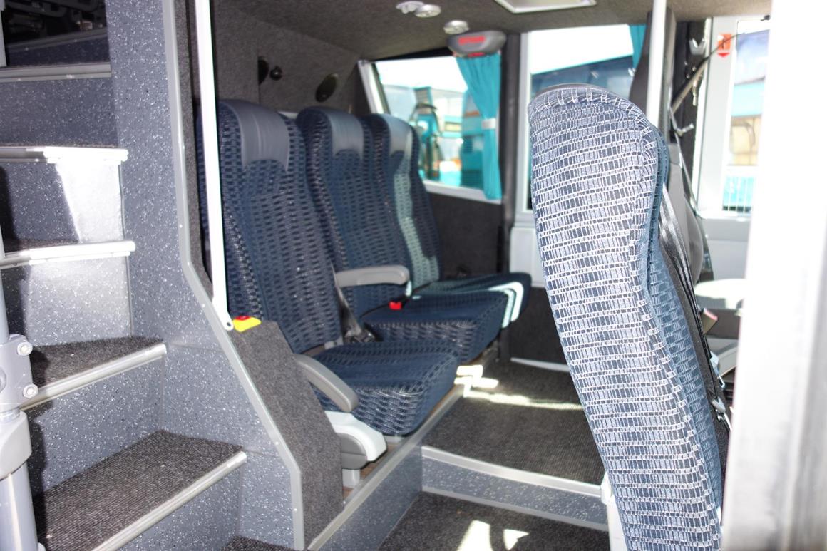 2 Reiseleitersitze mit großzügigem Sitzabstand. Diese können bei Bedarf demontiert werden, sodass ein Rollstuhlfahrer in seinem Rollstuhl befördert werden kann.